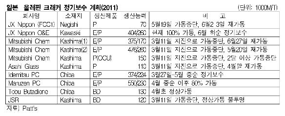 표, 그래프: < 일본 올레핀 크래커 정기보수 계획(2011) > <화학저널 2011/06/09> |