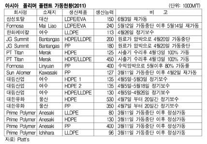 표, 그래프: < 아시아 폴리머 플랜트 가동현황(2011) > <화학저널 2011/06/13> |