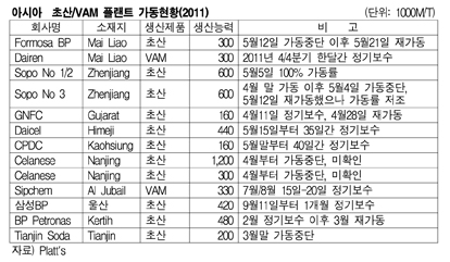 표, 그래프: < 아시아 초산/VAM 플랜트 가동현황(2011) > <화학저널 2011/06/13> |