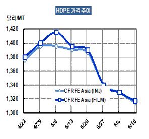 HDPE 가격은 6월8일 CFR FE Asia 톤당 1320달러로 15달러 하락했다.
