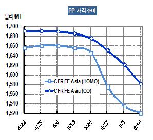 PP 가격은 6월8일 CFR FE Asia 톤당 1520달러로 15달러 하락했다.