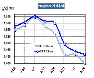 프로필렌 가격은 6월10일 FOB Korea 톤당 1401달러로 40달러 급락했다.