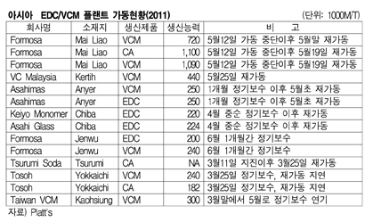 표, 그래프: < 아시아 EDC/VCM 플랜트 가동현황(2011) > <화학저널 2011/06/14> |