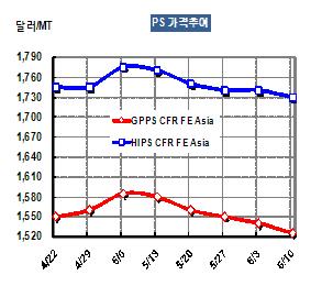 GPPS 가격은 6월8일 CFR FE Asia 톤당 1525달러로 15달러 하락했다.
