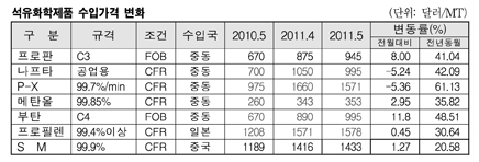 표, 그래프: < 석유화학제품 수입가격 변화 > <화학저널 2011/06/17> |