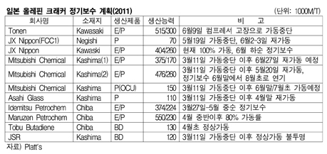 표, 그래프: < 일본 올레핀 크래커 정기보수 계획(2011) > <화학저널 2011/06/17> |