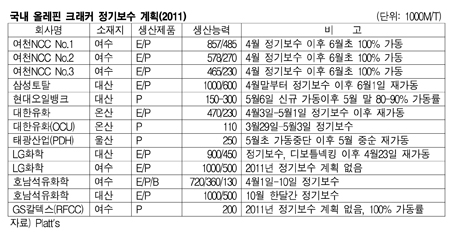 표, 그래프: < 국내 올레핀 크래커 정기보수 계획(2011) > <화학저널 2011/06/20> |