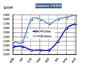 부타디엔 가격은 6월17일 FOB Korea 톤당 3900달러로 50달러 상승했다.