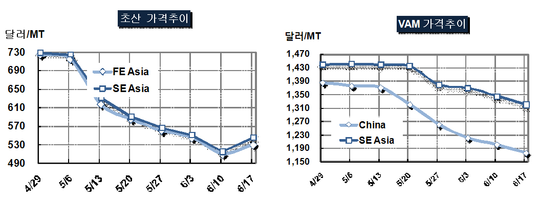 아시아 VAM(Vinyl Acetate Monomer) 시세는 공급이 현상을 유지하고 있는 반면 중국수요가 줄어들어 하락세를 지속하고 있다.