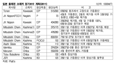 표, 그래프: < 일본 올레핀 크래커 정기보수 계획(2011) > <화학저널 2011/06/24> |