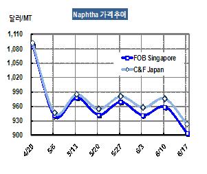 나프타 가격은 6월17일 C&F Japan 톤당 923달러로 53달러 폭락했다.