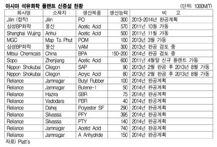 표, 그래프: < 아시아 석유화학 플랜트 신증설 현황 > <화학저널 2011/06/24> |