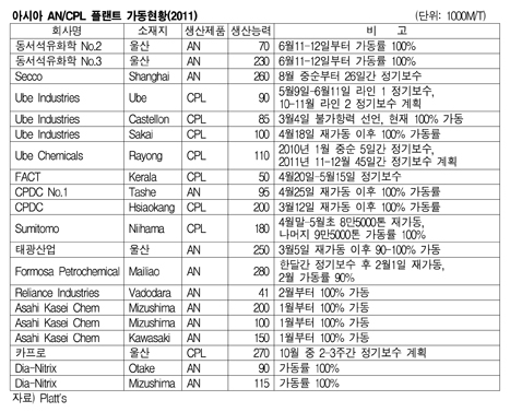 표, 그래프: < 아시아 AN/CPL 플랜트 가동현황(2011) > <화학저널 2011/06/27> |