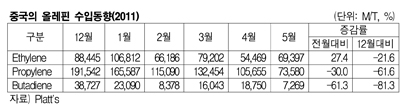 표, 그래프: < 중국의 올레핀 수입동향(2011) > <화학저널 2011/06/28> |