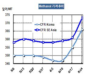 메탄올 가격은 6월24일 CFR Korea 톤당 366달러로 11달러 상승했다.