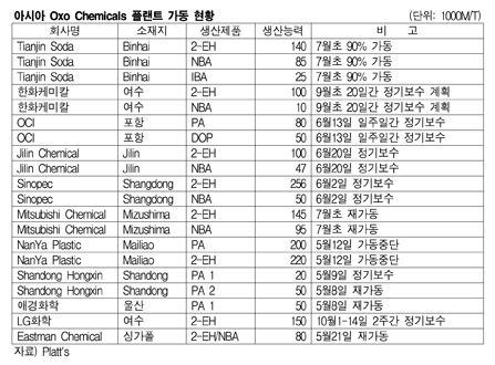 아시아 옥소알콜(Oxo-Alcohol) 시장은 정기보수가 이어지면서 수급타이트가 지속될 것으로 예상된다. 국내에서는 OCI가 포항 소재 PA 8만톤 및 DOP(Diotyl Phthatate) 5만톤 플랜트를 6월13일부터 일주일간 정기보수했고, 애경화학도 울산 소재 PA 5만톤 1라인을 5월8일 재가동했다. 표, 그래프: < 아시아 Oxo Chemicals 플랜트 가동 현황 > <화학저널 2011/06/30> |