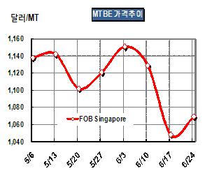 MTBE 가격이 6월24일 FOB Singapore 톤당 1069달러로 17달러 상승했디.