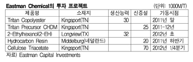 다만, PET(Polyethylene Terephthalate) 사업은 큰 폭의 변동성을 고려해 사업을 중단한지 몇 년 됐기 때문에 PET 매출 포트폴리오를 재편했다. 표, 그래프: < Eastman Chemical의 투자 프로젝트 > <화학저널 2011/07/01> |