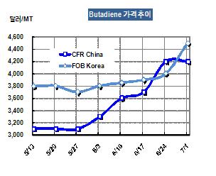 부타디엔 가격은 7월1일 FOB Korea 톤당 4500달러로 500달러 폭등했다. 미국의 부타디엔 Spot 가격이 FOB US Gulf 파운드당 215센트로 톤당 4740달러에 달하면서 아시아산 수입을 확대하고 있기 때문이다. 표, 그래프: < Butadiene 가격추이 > <화학저널 2011/07/04> |