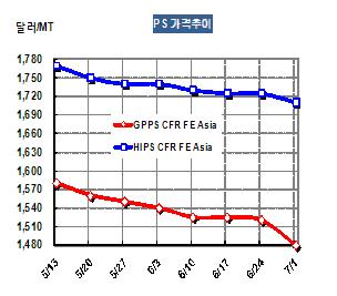 GPPS 가격은 6월29일 CFR FE Asia 톤당 1480달러로 40달러 급락했다.