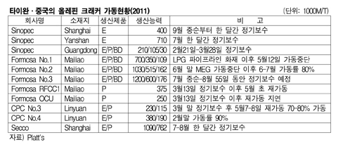 프로필렌은 Formosa의 정기보수와 가동중단이 겹쳐 여전히 공급이 부족할 것으로 예상된다. 표, 그래프: < 타이완․중국의 올레핀 크래커 가동현황(2011) > <화학저널 2011/07/06> |