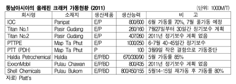 표, 그래프: < 동남아시아의 올레핀 크래커 가동현황 (2011) > <화학저널 2011/07/07> |