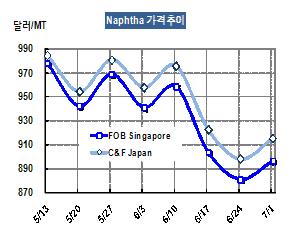 나프타 가격은 7월1일 CFR Japan 톤당 915달러로 17달러 상승했다. 그러나 나프타 가격이 다시 900달러를 넘어서고 에틸렌(Ethylene) 및 프로필렌(Propylene)의 하락세 지속으로 나프타 크래커의 가동률이 낮아지면서 다시 하락할 가능성이 나타나고 있다. 표, 그래프: < Naphtha 가격추이 > <화학저널 2011/07/08> |
