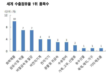 표, 그래프: < 세계 수출점유율 1위 품목수 > <화학저널 2011/07/08> |
