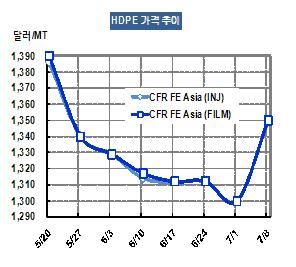 HDPE 가격은 7월6일 CFR FE Asia 톤당 1350달러로 50달러 급등했다.