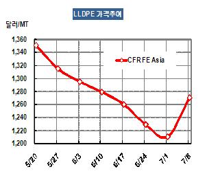 LLDPE 가격은 7월6일 CFR FE Asia 톤당 1270달러로 60달러 급등했다.