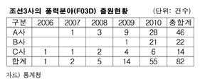 표, 그래프: < 조선3사의 풍력분야(F03D) 출원현황 > <화학저널 2011/07/12> |