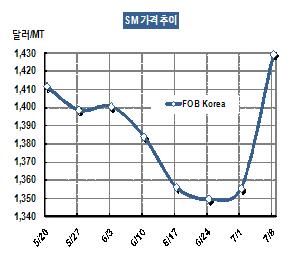 SM 가격은 7월8일 FOB Korea 톤당 1430달러로 74달러 폭등했다.