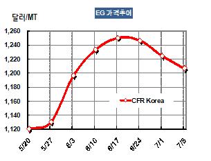 아시아 MEG(Monoethylene Glycol) 시세는 7월4일 1232달러로 상승했으나 타이완 Nanya Plastics 플랜트가 재가동 되면서 하락세로 전환됐다.