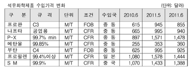 표, 그래프: < 석유화학제품 수입가격 변화 > <화학저널 2011/07/15> |