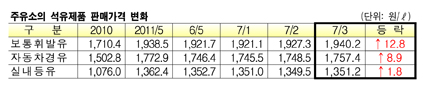 표, 그래프: < 주유소의 석유제품 판매가격 변화 > <화학저널 2011/07/25> |