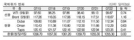 7월22일 0.84달러 올라 112.34달러 … WTI도 100달러 눈앞