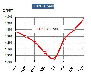 LLDPE 가격은 7월20일 CFR FE Asia 톤당 1331달러로 31달러 상승했다.
