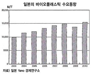 일본 Yano경제연구소에 따르면, 2009년 일본의 바이오플래스틱 수요는 1만3690톤으로 전년대비 7.7% 감소했다. 표, 그래프: < 일본의 바이오플래스틱 수요동향 > <화학저널 2011/07/26> |