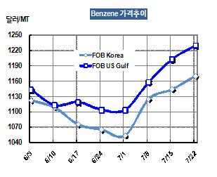 벤젠 가격은 7월22일 FOB Korea 톤당 1170달러로 26달러 상승했다.