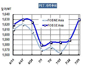 Bottle 그레이드 PET 칩 가격이 7월27일 FOB NE Asia 톤당 1630달러로 40달러 상승했다.