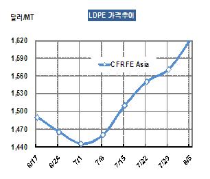 LDPE 가격은 8월3일 CFR FE Asia 톤당 1621달러로 50달러 연속 상승했다.