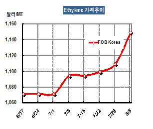 에틸렌 가격은 8월5일 FOB Korea 톤당 1149달러로 40달러 급등했다. 타이완 당국이 화재 이후 안전점검 명령을 내려 Formosa 플랜트의 재가동 일정이 불확실해짐에 따라 Spot 수요가 크게 증가할 것이 확실시되고 있다. 표, 그래프: < Ethylene 가격추이 > <화학저널 2011/08/08> |