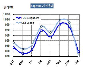 나프타 가격은 8월5일 C&F Japan 톤당 871달러로 127달러 폭락했다. 유럽 역시 글로벌 경제위기 확산 우려가 현실화되면서 CIF ARA 톤당 908달러로 급락했다. 표, 그래프: < Naphtha 가격추이 > <화학저널 2011/08/08> |