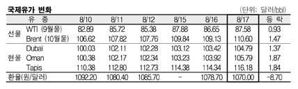 8월17일 국제유가는 뉴욕증시 상승세에 따른 경기 회복 기대감과 휘발유의 재고 감소 소식으로 상승했다. 표, 그래프: < 국제유가 변화 > <화학저널 2011/08/18> |