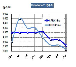 부타디엔 가격은 8월12일 FOB Korea 톤당 3845달러로 85달러 폭락했다.
