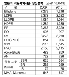 표, 그래프: < 일본의 석유화학제품 생산능력 > <화학저널 2011/08/19> |