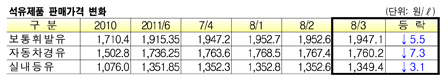 그러나 휘발유 가격은 8월7일 1954.23원을 정점으로 하락하기 시작해 8월19일까지 12일 연속으로 떨어졌고 경유 평균가격 역시 8월6일 1769.28원을 시작으로 13일 연속 하락했다. 표, 그래프: < 석유제품 판매가격 변화 > <화학저널 2011/08/22> |