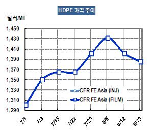 HDPE 가격은 8월17일 CFR FE Asia 톤당 1385달러로 16달러 하락했다.