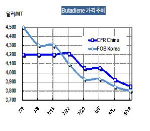 부타디엔 가격은 8월19일 FOB Korea 톤당 3800달러로 45달러 하락했다.