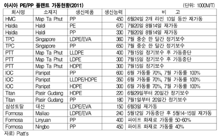 한편, 인디아의 Haldia Petrochemical은 8월14일 Haldi 소재 PE 67만톤 및 PP 33만톤 플랜트를 재가동했다. 표, 그래프: < 아시아 PE/PP 플랜트 가동현황(2011) > <화학저널 2011/08/22> |